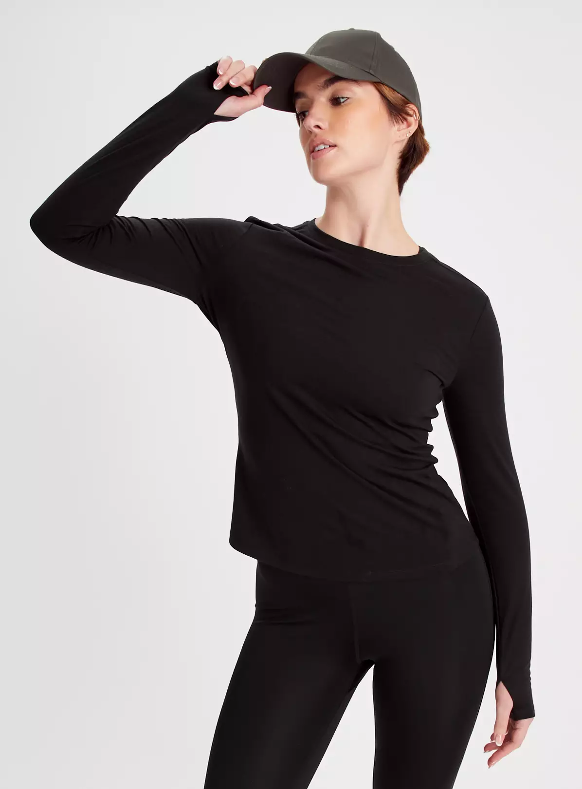 Active black long sleeve top Thumbhole design Model wears a size S Model’s height is 5’8″