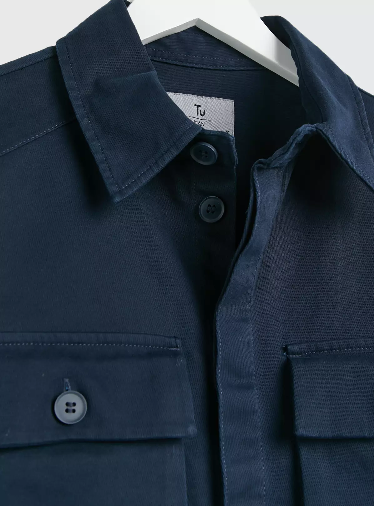 Navy textured shacket Button fastening Cotton-rich Model wears a size M Model chest size is 40″ Model height is 6’2″