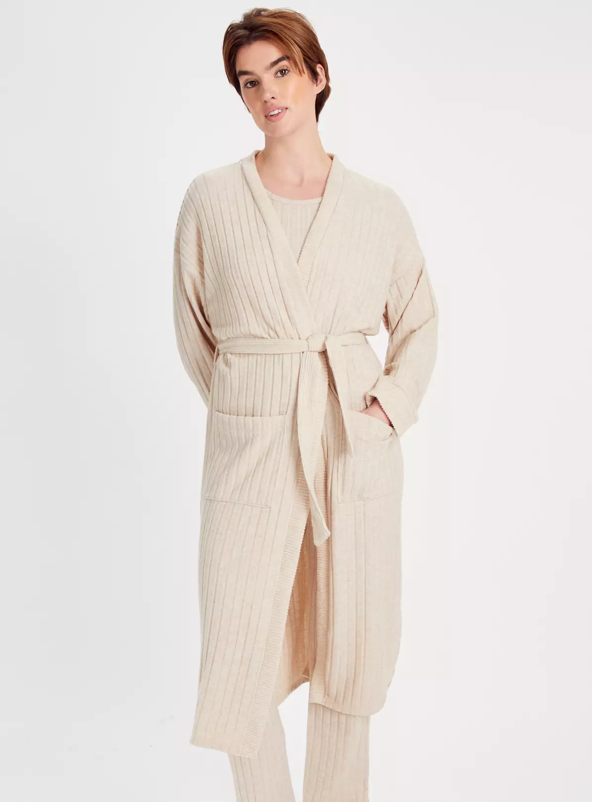 Oatmeal ribbed dressing robe Tie-waist belt Contains recycled fibres Model wears a size S Model’s height is 5’8″ Keep away from fire