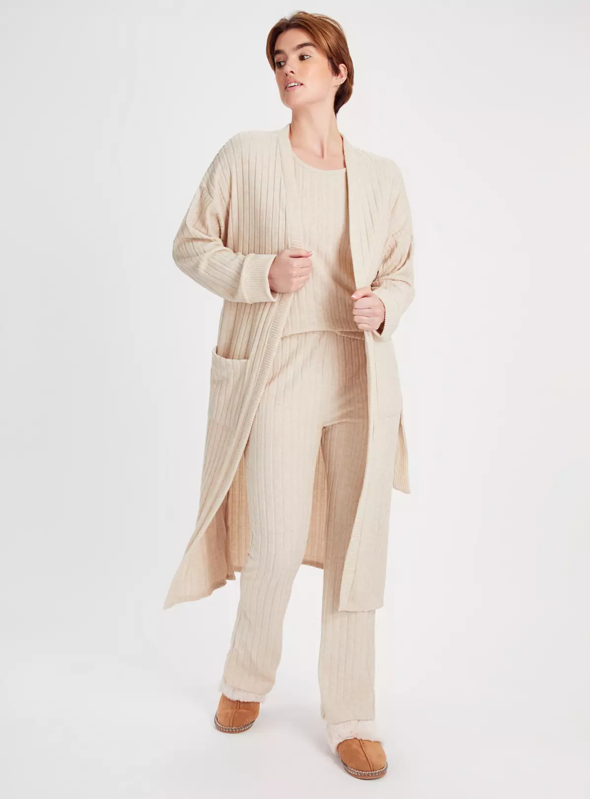 In a comfy ribbed fabric, our oatmeal dressing robe is a must-have addition to your casualwear wardrobe! It features a tie-waist belt and comes in a longline length for a snuggly fit. Perfect for this winter!